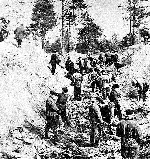 然而在1943年,占领斯摩棱斯克的德国军队首先掘开了第一个“万人坑”,发现4000余具尸体。这个足以让同盟国与苏联离心的消息被迅速带到德国,4月,柏林、同盟国的广播中都播放着这样的新闻:“一个深坑……2万波兰士兵的尸体……”